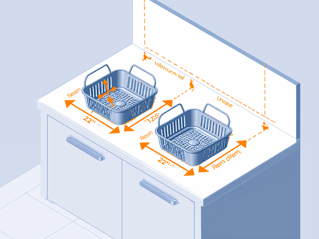 - Ninja: Requires 15" front swing space to pull basket + 4" rear airflow gap. Blocks 37% of standard 24" deep counters.